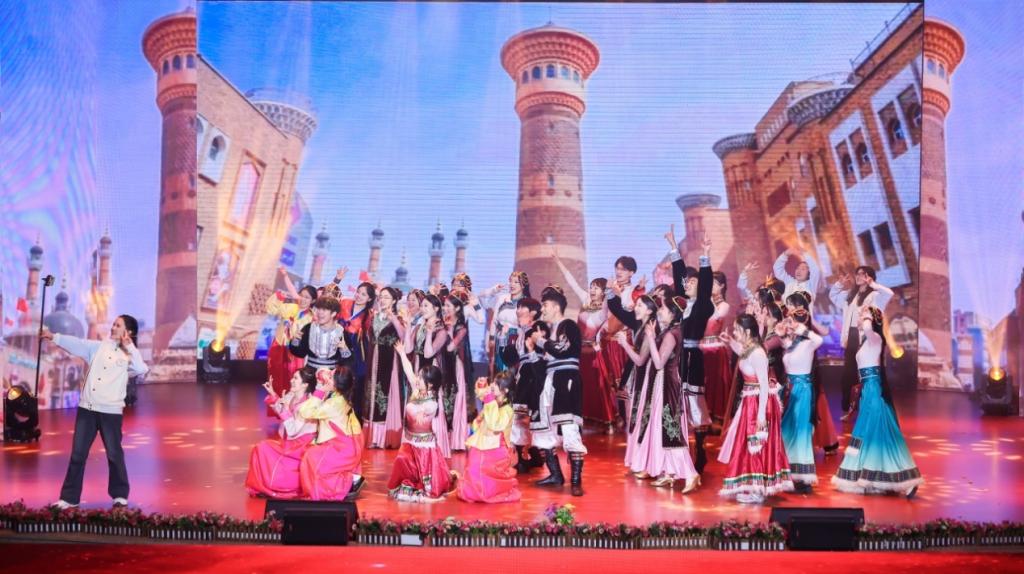 由钟小康、娜飞沙·亚力坤和肖烨姝老师指导,由beat365体育官方网站合欢花工作室、大学生舞蹈队、2022级口腔医学3班、4班同学组成的音乐舞蹈剧《看山看水看中国》获得三等奖。身着朝鲜族、蒙古族、藏族、维吾尔族民族传统服饰的同学们依次登台,用音乐传递民族风情,以舞蹈展现团结友爱,描绘了各民族在中华民族这个大家庭中像石榴籽一样紧密团结的美好景象。