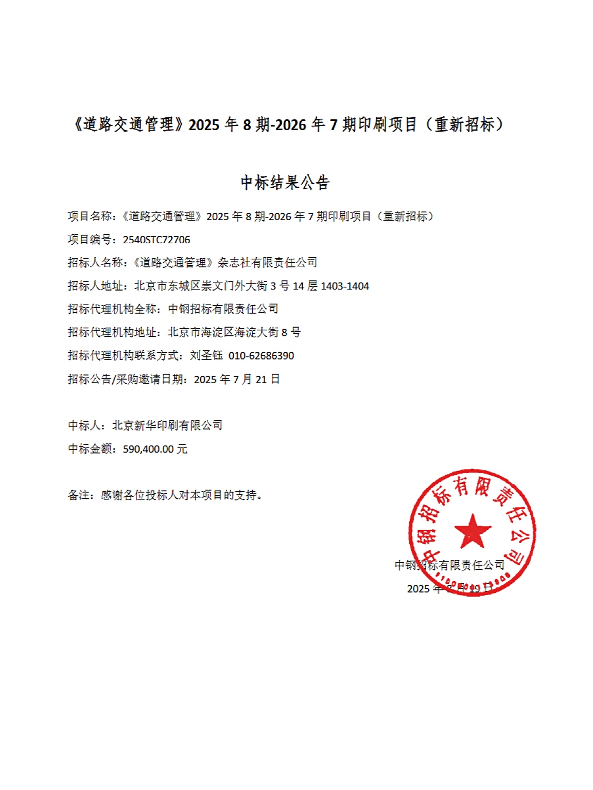 《道路交通管理》2025年第8期-2026年第7期印刷项目(重新招标)中标结果公告