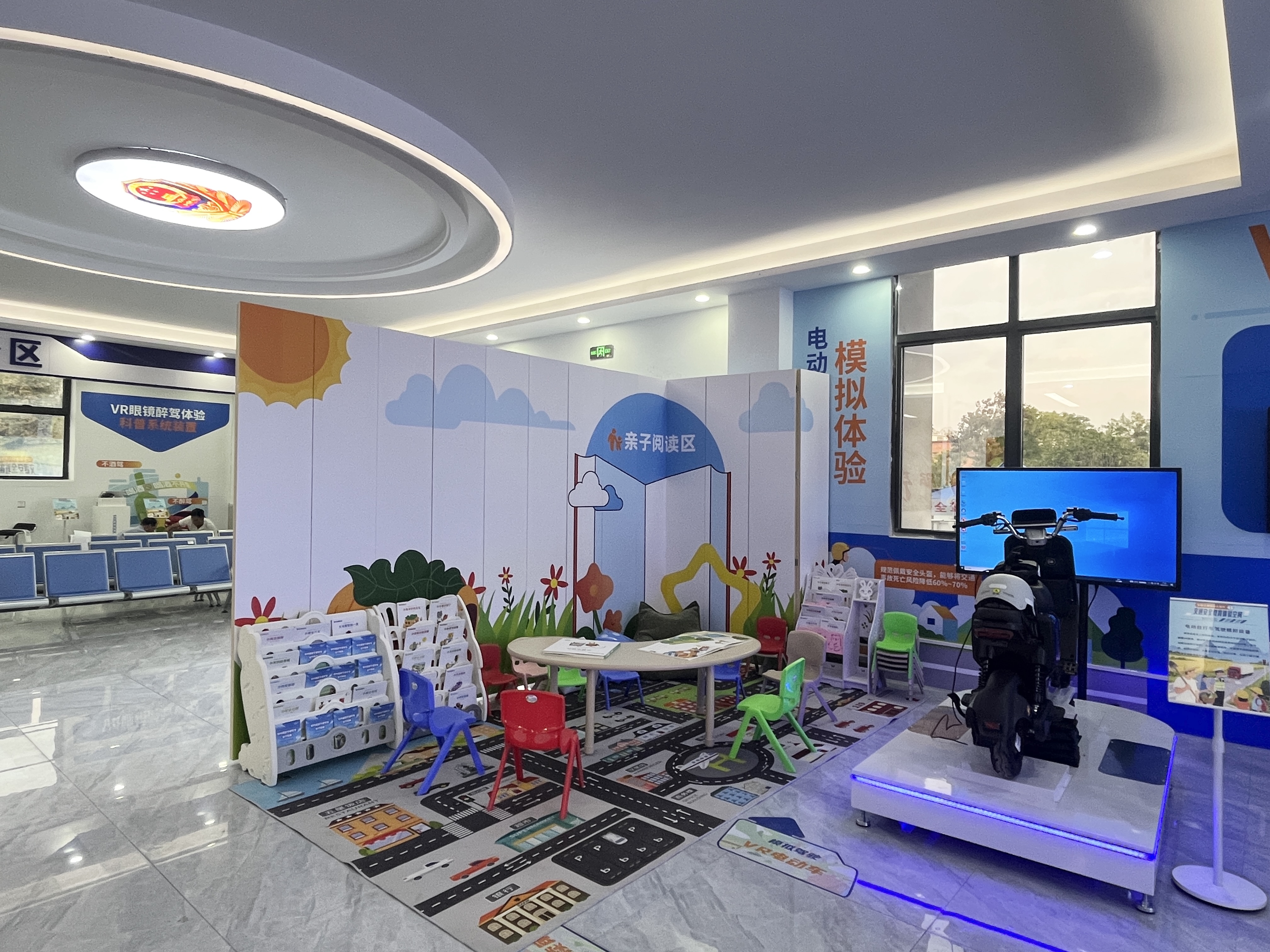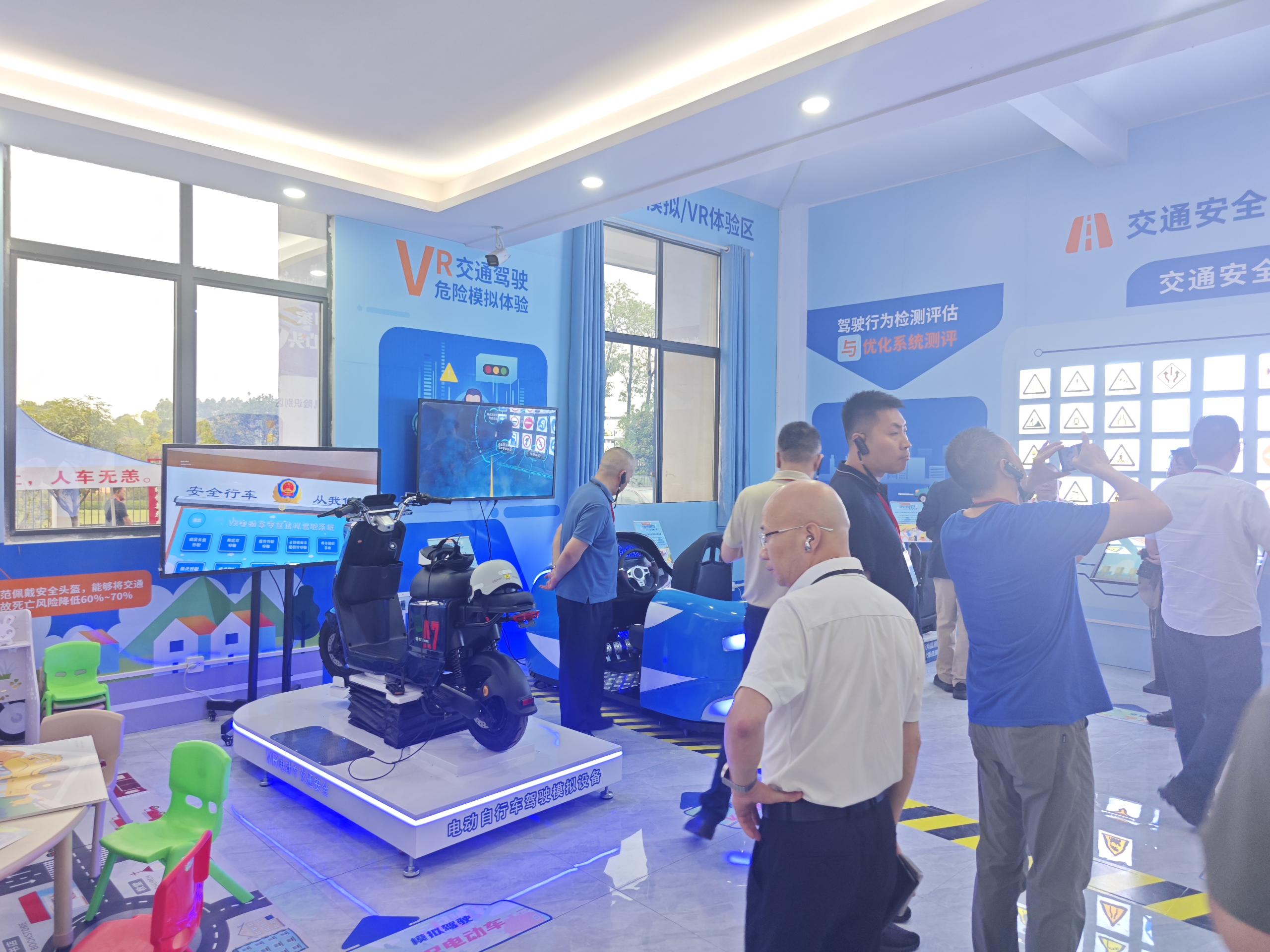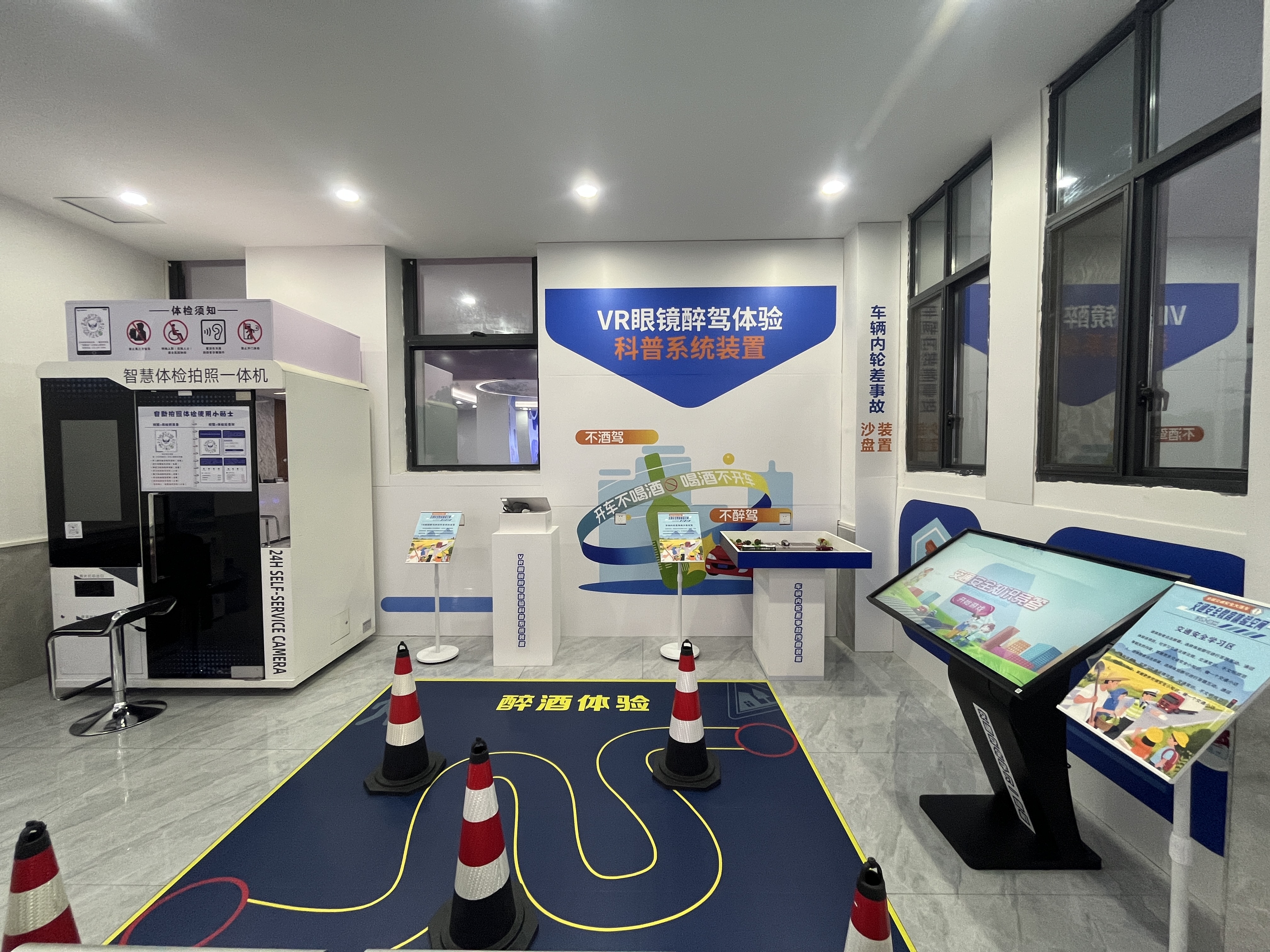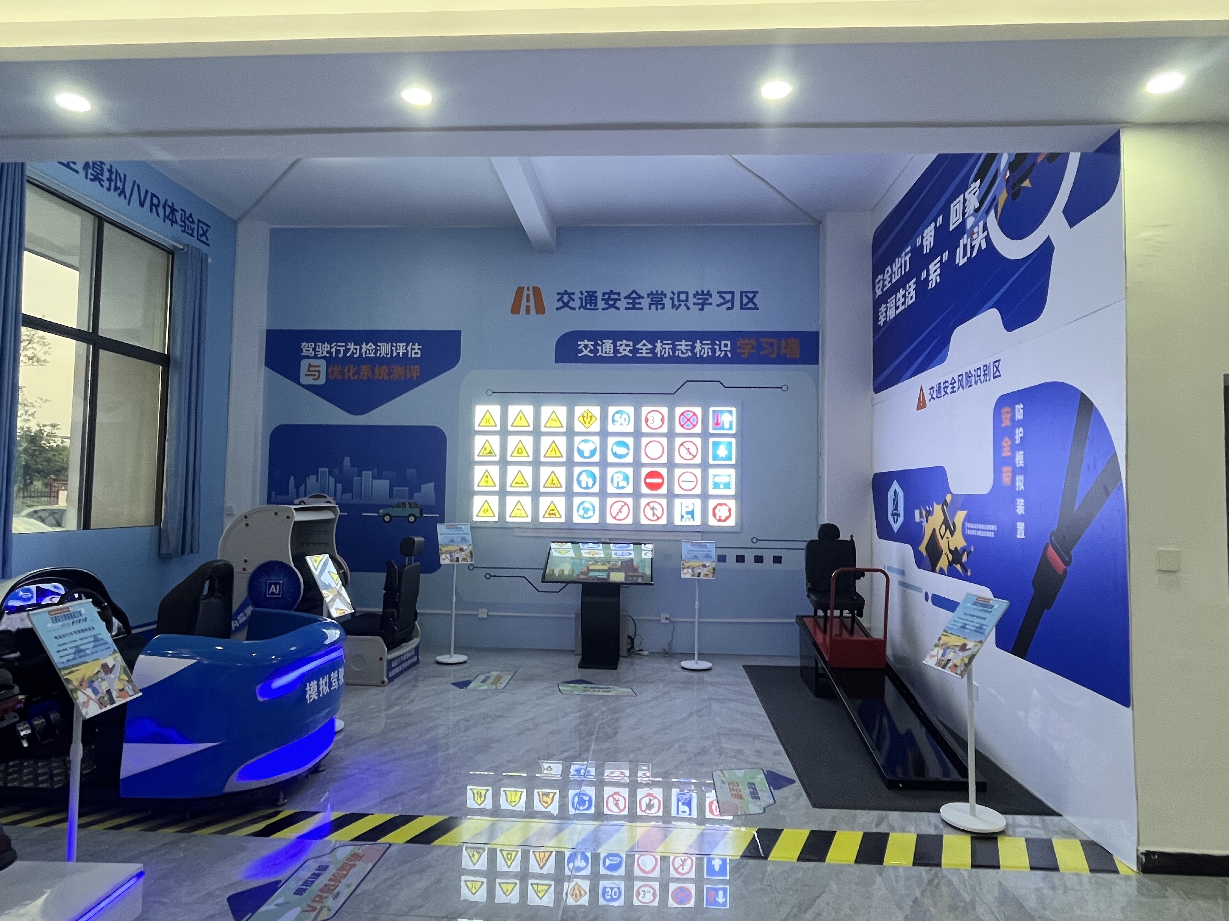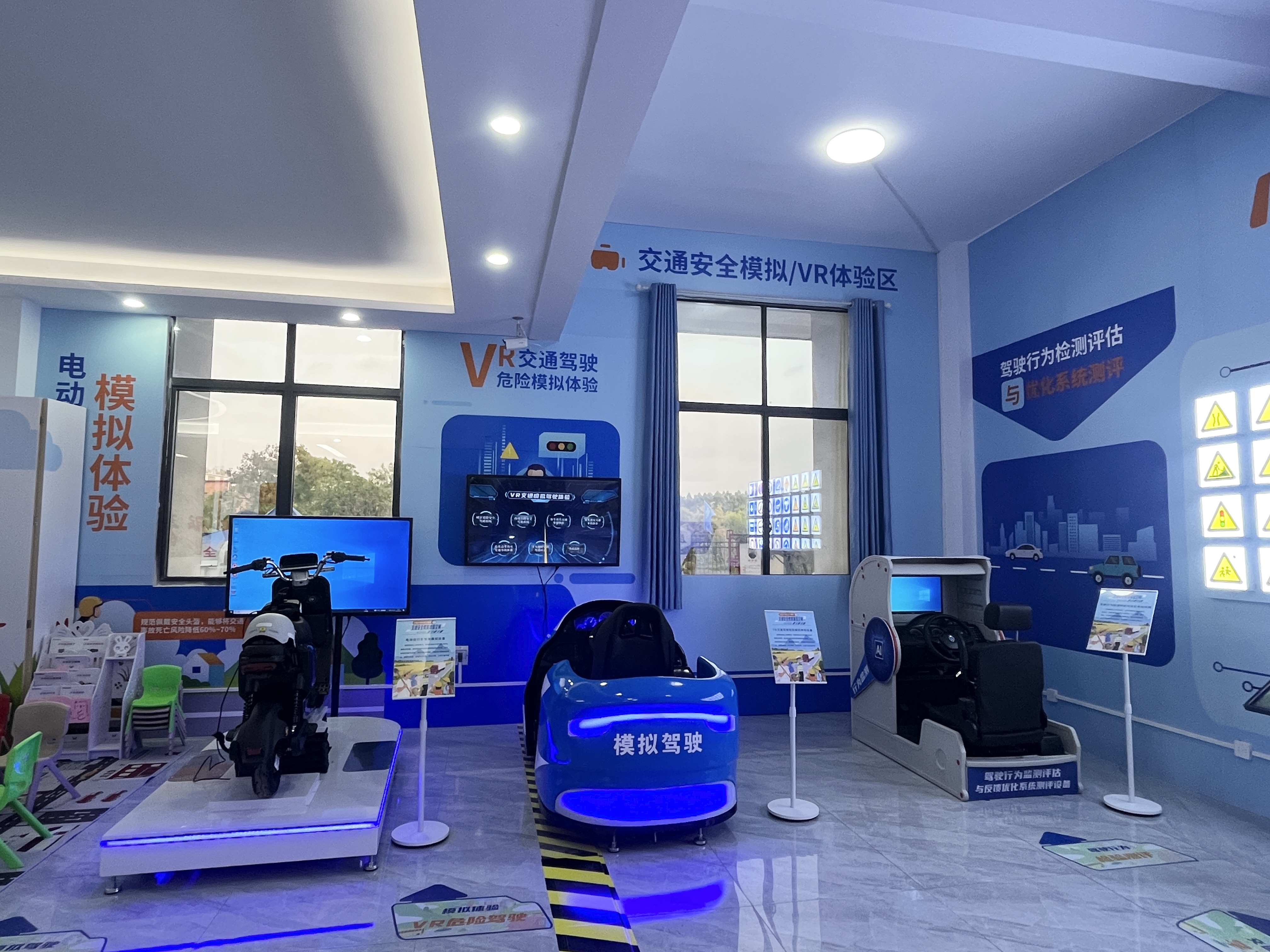 交通安全教育体验空间结合当地交通参与群体特征和农村交通安全宣传教育需求设置四大体验区域,分别是“交通安全常识学习区”、“交通安全模拟/VR体验区”、“交通安全风险识别区”和“交通安全亲子互动区”,包含了电动自行车模拟器、安全驾驶模拟器、驾驶行为检测评估设备、VR眼镜醉驾体验设备、安全带防护装置、安全头盔体验装置及车辆内轮差事故沙盘等设备,通过专业的讲解和亲身体验等方式,进一步引导村民知危险会避险,提升安全意识和自护能力,让交通安全文化深植美丽乡村,助力乡村全面振兴。