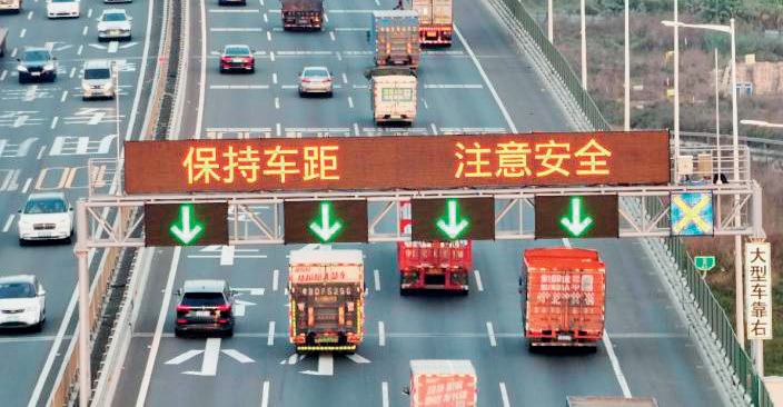 拥堵预警与信息发布系统通过在关键节点上游设置的大型可变信息标志,将下游路段的实时路况,以图形化(如红黄绿路网图)或文字化的形式直观地展示给驾驶人,如图5所示。通过该方式,驾驶人能够提前获知拥堵长度、预计通行时间等关键信息,从而做出更合理的决策。