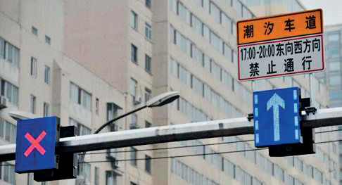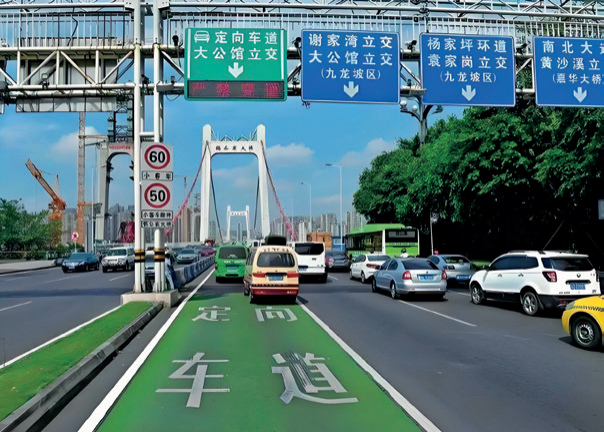 潮汐车道是应对方向性交通流严重不均衡问题的标志性手段,其核心在于通过技术手段使车道方向可变,在特定时段将对向闲置车道资源分配给拥堵方向,有效提升断面整体通行水平,尤其适用于高峰流量方向占比超过65%的放射性道路,如图1所示。其实践方式主要有两种:一是利用龙门架上方的可变车道指示标志和LED信息板,清晰指示车道在不同时段的允许行驶方向;二是在有条件的路段,采用可移动的中央隔离护栏进行物理隔离,以最高级别的安全性保障行车秩序。