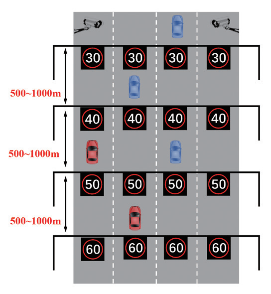 可变限速控制不再依赖固定的限速牌,而是通过沿线部署的交通流检测器,在系统预判拥堵即将形成或存在安全风险(如雨雪天气、前方事故)时,自动、逐级地降低上游路段的限速值,并通过LED可变限速标志发布,如图4所示。其作用在于实现“交通流的谐波化”,通过主动、平缓地降低车速,从源头抑制因紧急制动引发的交通扰动,有效阻断拥堵向上游蔓延。