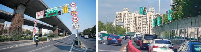 动态路肩是一种更为灵活的短时扩容方案,主要应用于一些具有结构性瓶颈、高峰时段拥堵常态化的路段。通过在路段上游设置龙门架及车道指示器,在拥堵发生或即将发生时,将路肩的“禁止通行”红色叉形标志,切换为“允许通行”的绿色箭头标志,临时将其开放为行车道,如图2所示。此管控方式成本低,不仅能提供弹性容量,而且能在应对偶发事件导致车道被占用时,快速开辟出应急通道。实施动态路肩的前提是,路肩必须具备与行车道同等的结构强度,并设置完善的应急停车港湾,以确保交通安全。