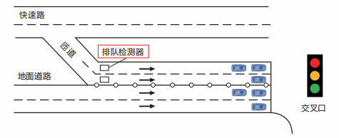 实施出入口匝道与地面道路的协同控制,是提升城市路网运行效率、防范局部拥堵演变为区域交通瘫痪的关键手段。当入口匝道排队即将溢出至上游路口时,系统可主动协调路口信号,提前截流或限制驶向匝道的车流,防止拥堵蔓延至地面路网。在出口匝道下游,则可设置交叉口可变车道,通过可变标志动态调整车道功能(如将直行车道临时变为左转车道),以匹配不同时段的转向需求变化,提升出口节点的疏散能力。此外,还可实施出口匝道与交叉口信号协同控制,如图7所示,根据匝道排队长短,动态调整下游路口的绿灯时间,加速车辆疏散。