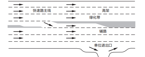 城市快速路并非孤立存在,主路承担长距离、高时效的“通过性”交通,辅路则服务沿线地块的“到达性”交通,快速路主线与辅路系统的衔接效率直接影响其集散功能。一个设计优良的主辅路系统,通过合理的物理隔离与出入口设计,将短距离、低速交通剥离至辅路,可有效保障主线高速交通流的连续性。如图8所示,辅路及其与主路间的连接匝道,为车辆汇入驶离提供了必要的加减速和车辆交织空间,使得交通转换过程远离高速运行的主线,提升了安全性。