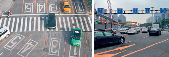 定向车道旨在解决主线上因大量车辆前往同一出口而引发的剧烈交织问题,通常设置在通往大型交通枢纽(如机场、火车站)或关键跨江桥梁等重要节点的前方路段。将最内侧或最外侧的一条或多条车道,通过醒目的地面标线(如绿色铺装结合文字指示)、清晰的龙门架指路标志以及物理隔离设施(如分道体、柔性隔离桩),设置为专用通道,如图3所示。一旦车辆进入,便不允许随意变道直至出口。定向车道能够引导车辆提前、有序完成车道选择,将复杂的交织行为从拥堵节点前移至上游开阔路段,从而保障主线交通流的整体稳定性和安全性。