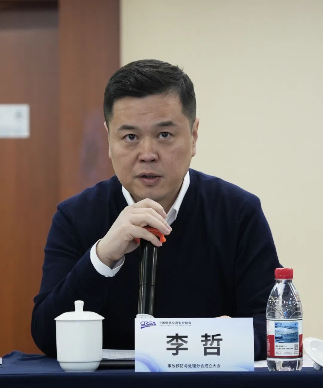 公安部交通管理局事故预防和处理指导处处长李哲讲话。首先,对事故预防与处理分会成立表示祝贺。指出,分会的成立搭建了跨行业、跨领域的交通安全协同治理平台,希望分会充分发挥桥梁和纽带作用,建立共建、共享、共治的协作机制。表示,公安部交通管理局事故预防和处理指导处将全力支持分会工作,在破解行业共性难题中发挥重要作用,为提升全国道路交通事故预防与处理工作水平提供有力支撑。