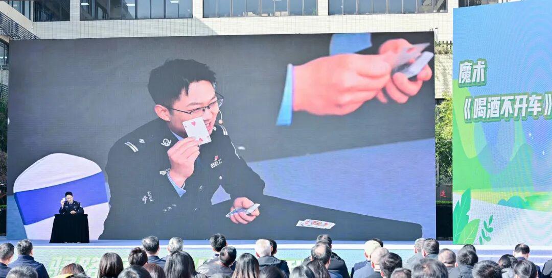 在交通安全主题展演环节,为此次主题活动专门制作的《青春同行》MV首先登场,用轻松明快的曲调演绎文明交通,传递“青春与安全同行”理念;魔术表演《喝酒不开车》,将抵制酒驾醉驾理念和魔术技法精妙融合,让现场观众大为惊叹;改编自真实案例的讲述《酒驾之殇》,让观众切身体会到酒醉驾可能给家人、家庭带来的沉重打击,令人动容;中国邮政选送的《一盔一带》小合唱,通过循环往复的歌咏强调骑乘戴盔、驾乘系带的安全性……