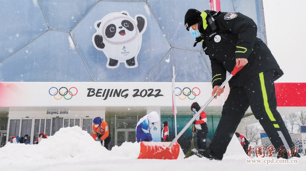北京市公安局朝阳分局民警在冰立方大门前扫雪铲冰。刘明翰摄