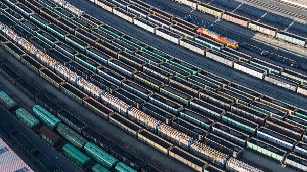 2025年10月18日,在中国铁路哈尔滨局集团有限公司绥芬河站南场,满载进口货物的列车等待解体换装(无人机照片)。新华社发(曲艺伟摄)